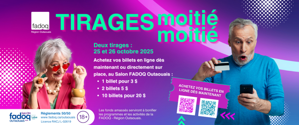 Ne manquez pas votre chance de remporter un gros lot en argent tout en soutenant les activités de la FADOQ – Région Outaouais. Chaque billet acheté vous donne une chance de remporter 50 % de la cagnotte récoltée à chaque tirage !