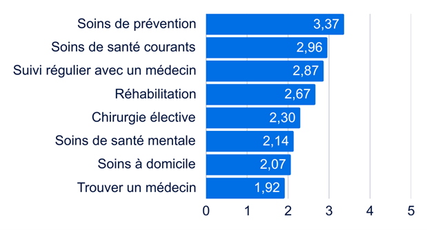 Le tableau ci-dessous présente les résultats par type de soin. Les répondants et répondantes devaient évaluer l’accessibilité à différents types de soins sur une échelle de 1 (pas du tout accessible) à 5 (très accessible).