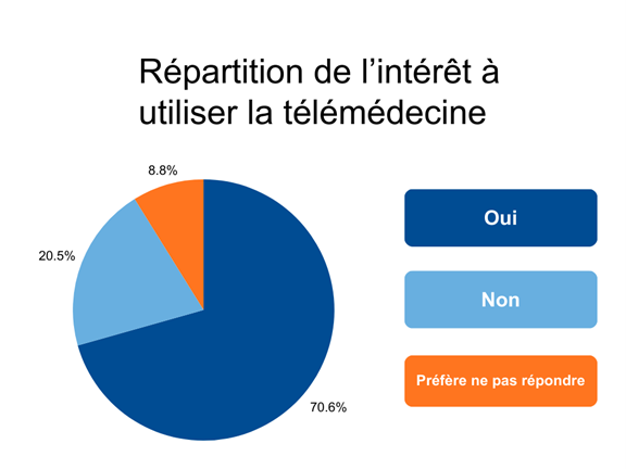 Le sondage met toutefois en lumière une avenue qui suscite un vif intérêt : la télémédecine. Plus de 10 000 répondants, soit 70 % des personnes sondées, se disent favorables à l’utilisation d’un service de télémédecine s’il était offert.